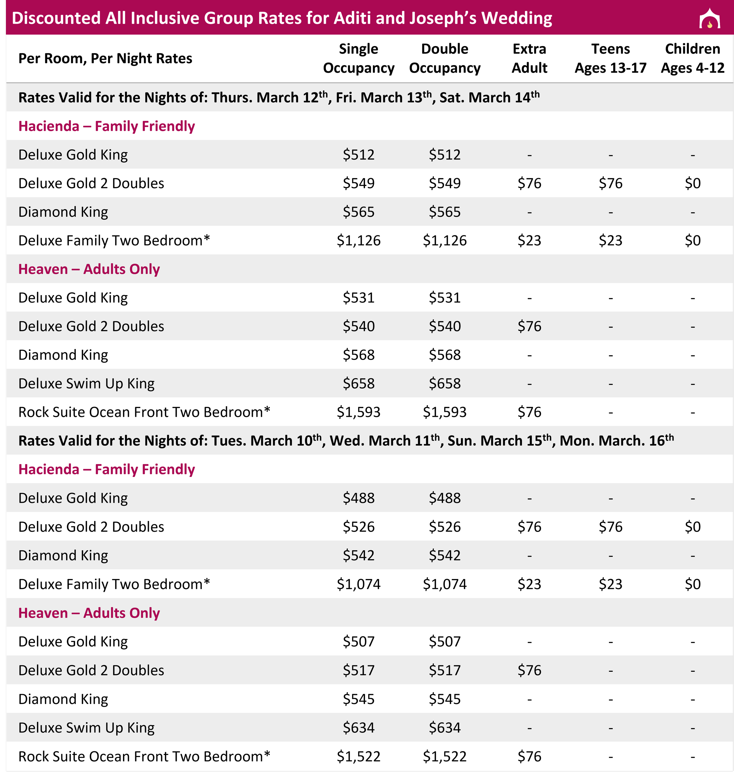 Infants 0-3 are free but count towards max occupancies; 3 night minimum required; Must book through group to receive wedding wristbands required to attend wedding events; Rates include taxes and fees;