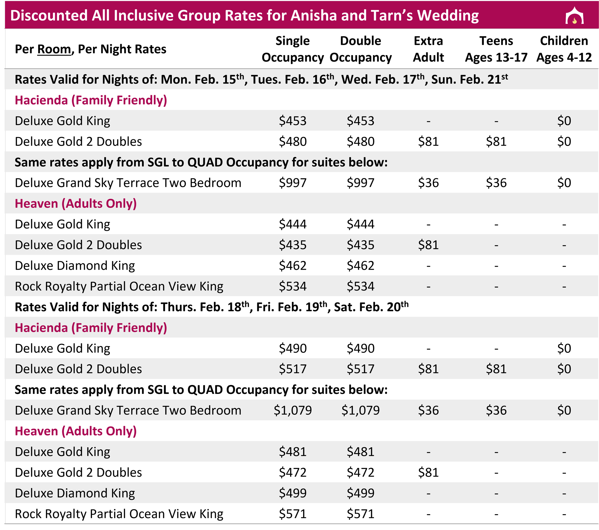 All rates above are in USD and include hotel taxes and fees; Infants 0-3 are free but count towards max occupancies; 3 night minimum required; Must book through group to receive wedding wristbands required to attend wedding events