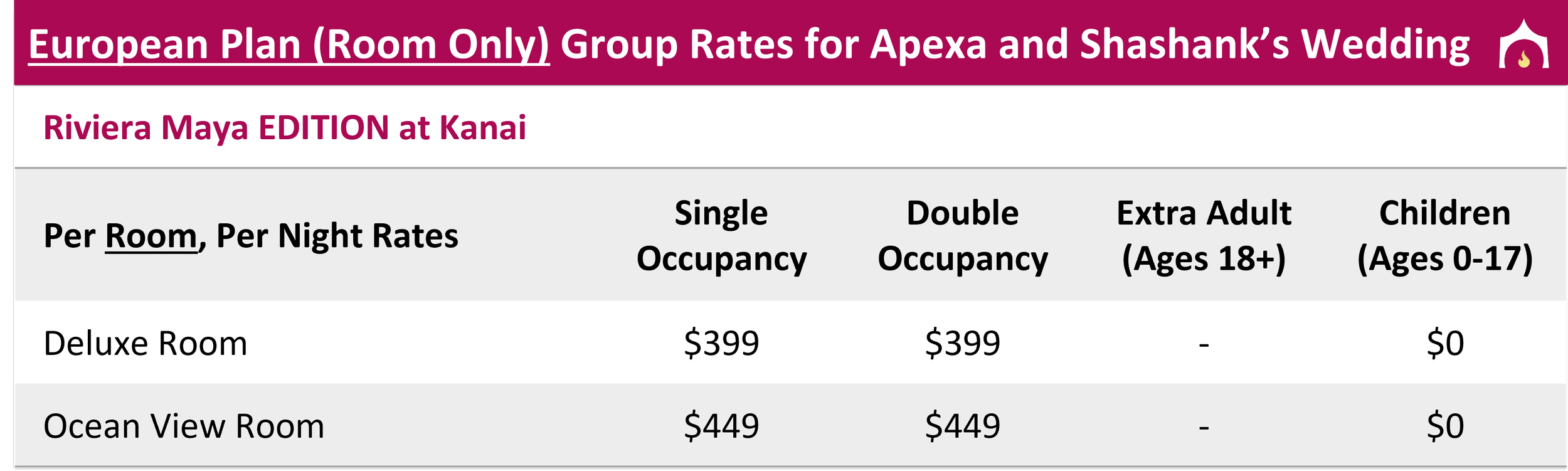Apexa and Shashank have secured discounted group rates for guests of their wedding! Rooms MUST be booked through their group block on this site by February 15, 2026 in order to attend wedding events, to be included in group promotions, to be protected by agency support in case of travel or other potential issues, to be given priority access to rooming requests and be placed in the group block located near the bride and groom's group. Guests booking on third party websites (like Expedia or Hotels.com) or on the hotel website directly will not be able to access wedding events.