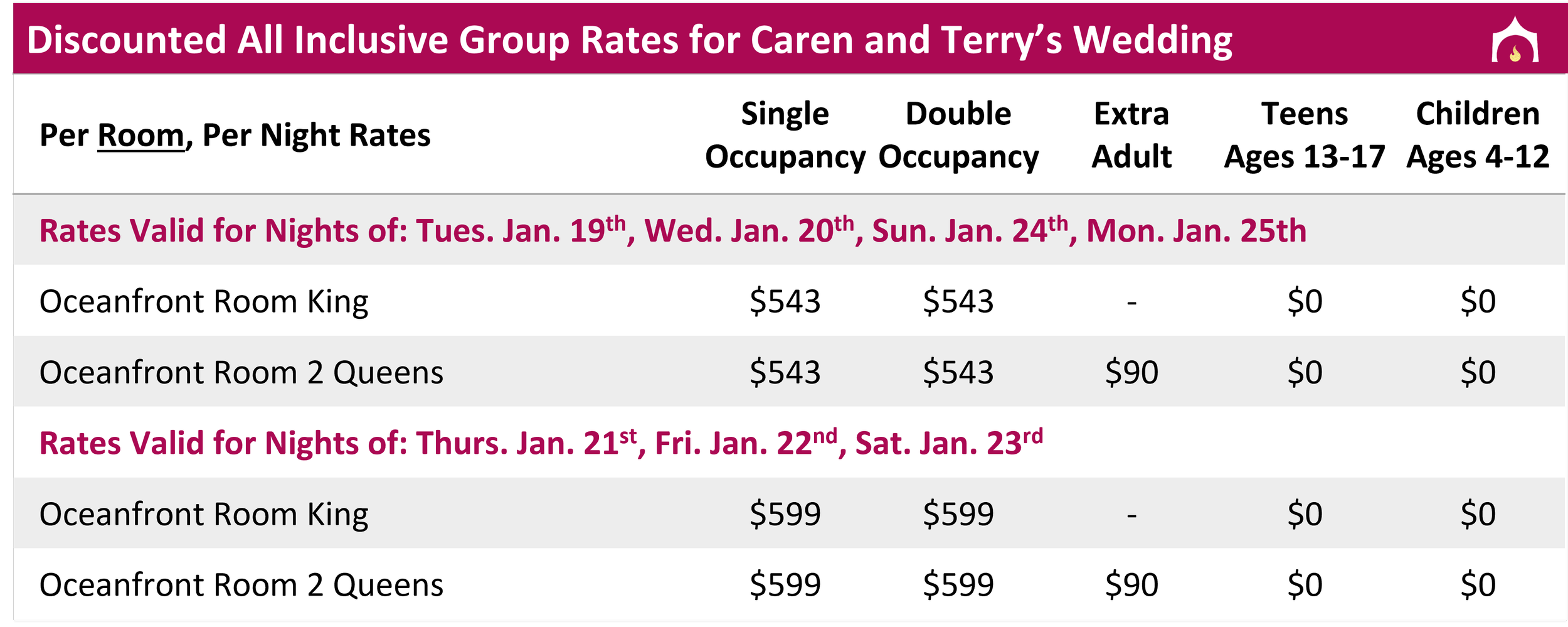 All rates above are in USD and include hotel taxes and fees; Infants 0-3 are free but count towards max occupancies; Must book through group to receive wedding wristbands required to attend wedding events; A 37 MXN peso/night (~$2 USD) environmental tax is charged at check out, subject to change; 3 night minimum stay required