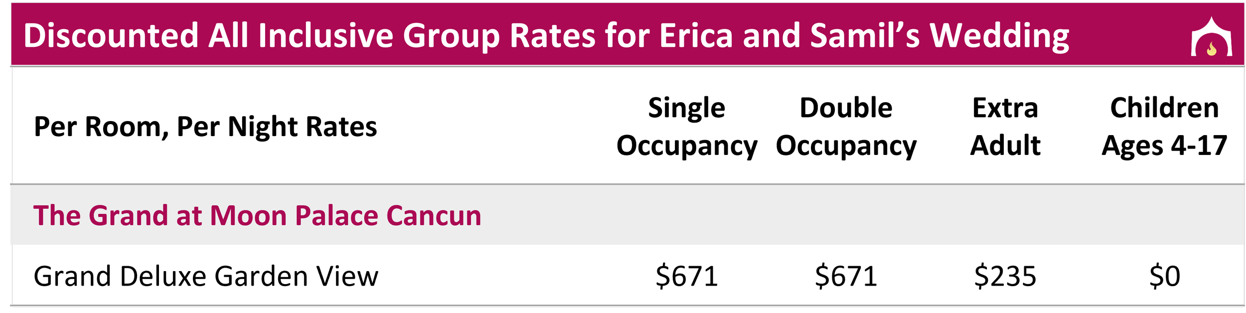 Erica and Samil have secured discounted group rates for guests of their wedding! Reservations MUST be made through the couple’s contracted wedding block by January 1, 2027 to complete the RSVP process and attend wedding events. Reservations made directly with the resort, via online travel agencies such as Expedia or Hotels.com, or via a third party travel agency will not meet the venue’s requirements to complete the RSVP process. We appreciate your abidance and understanding of the destination wedding processes and procedures in place.