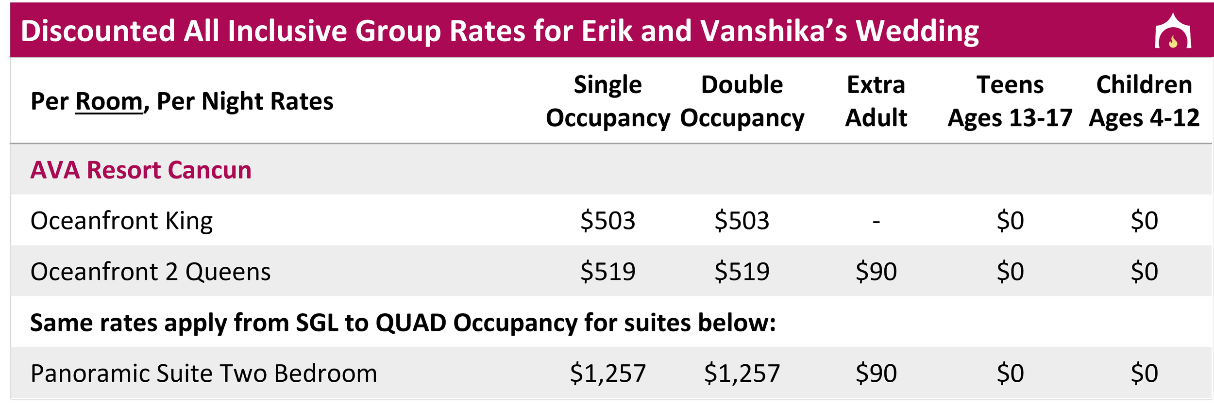 All rates above are in USD and include hotel taxes and fees; Infants 0-3 are free but count towards max occupancies; Must book through group to receive wedding wristbands required to attend wedding events; A 37 MXN peso/night (~$2 USD) environmental tax is charged at check out, subject to change; 3 night minimum stay required