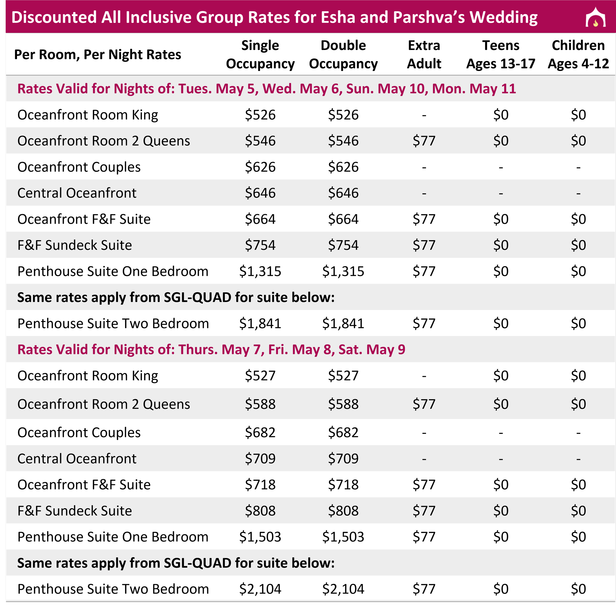All rates above are in USD and include hotel taxes and fees; Infants 0-3 are free but count towards max occupancies; 3 night minimum required; Must book through group to receive wedding wristbands required to attend wedding events; A 37 MXN peso/night (~$2 USD) environmental tax is charged at check out, subject to change.