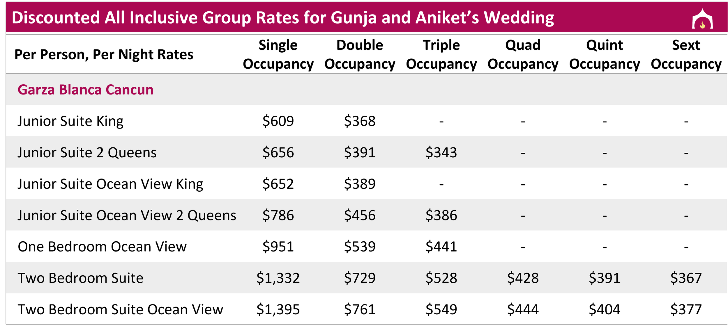 Rates are in USD and include hotel taxes and fees; Must book using All Inclusive Group Rates to attend events; 3 night minimum required; A 33 MXN peso/night (~$2.00 USD) environmental tax is charged at check out, subject to change.