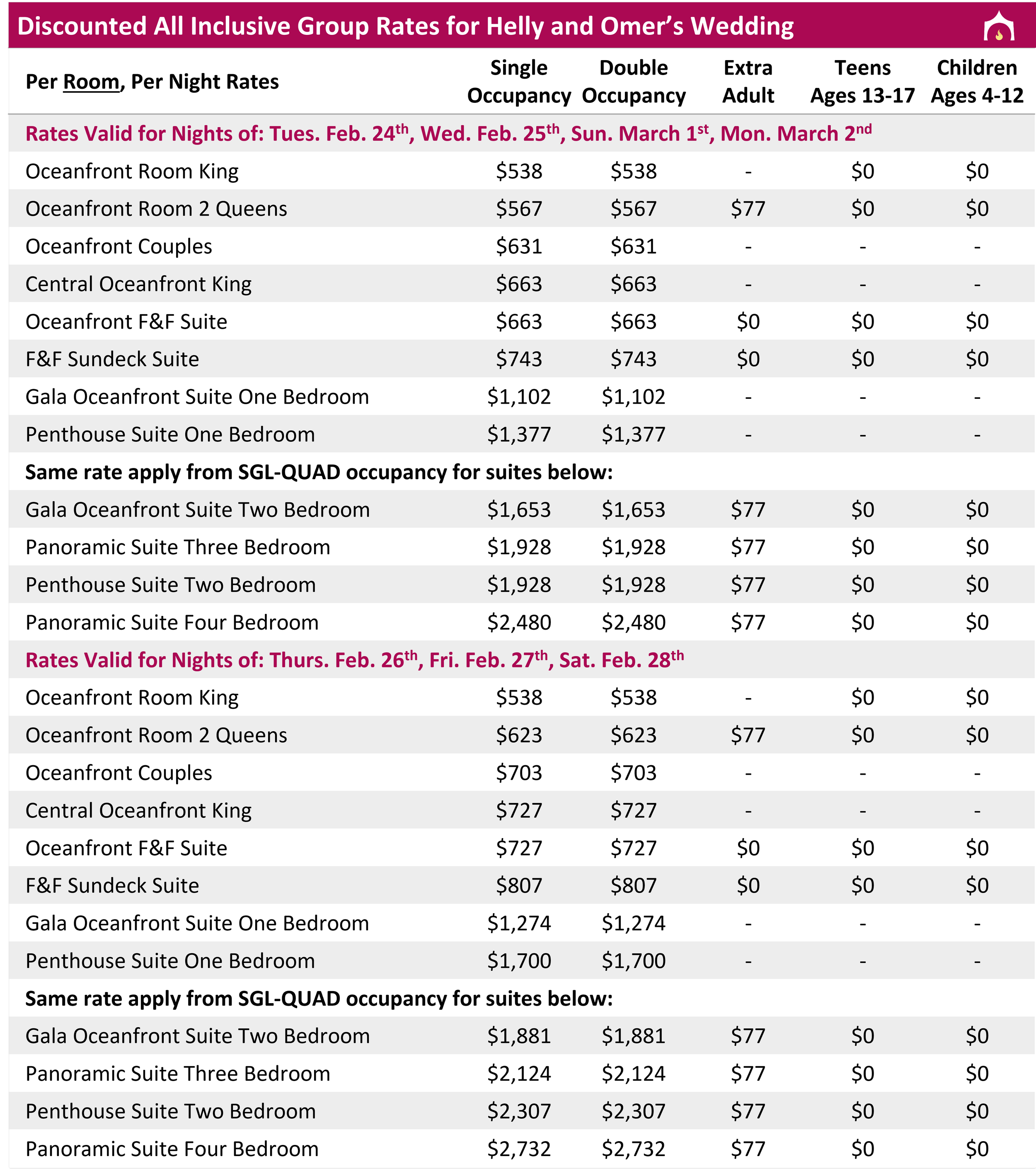 All rates above are in USD and include hotel taxes and fees; Infants 0-3 are free but count towards max occupancies; Must book through group to receive wedding wristbands required to attend wedding events; A 37 MXN peso/night (~$2 USD) environmental tax is charged at check out, subject to change; 3 night minimum stay required