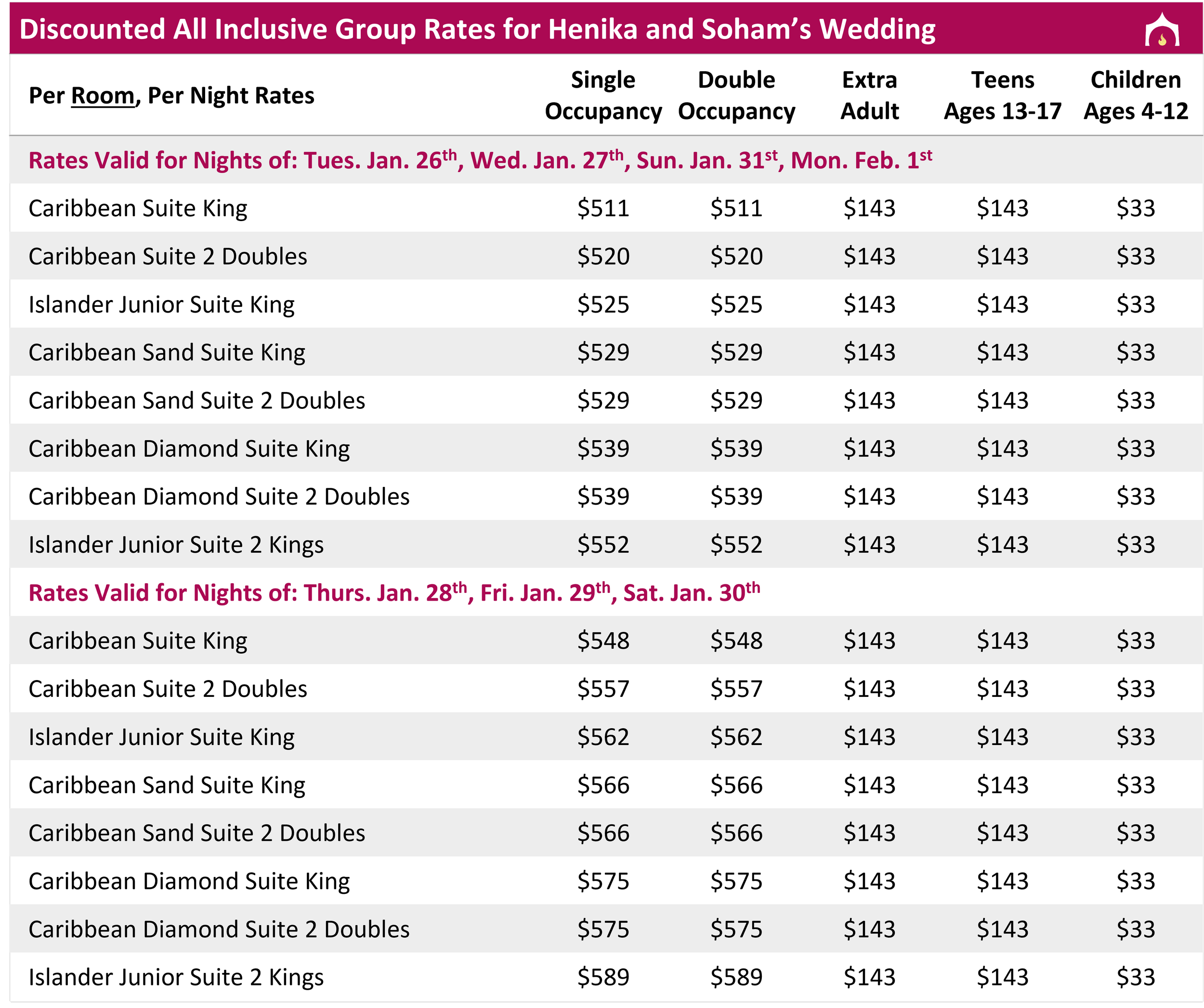 Henika and Soham have secured discounted group rates for guests of their wedding! Reservations MUST be made through the couple’s contracted wedding block by October 15, 2026 to complete the RSVP process and attend wedding events. Reservations made directly with the resort, via online travel agencies such as Expedia or Hotels.com, or via a third party travel agency will not meet the venue’s requirements to complete the RSVP process. We appreciate your abidance and understanding of the destination wedding processes and procedures in place.
