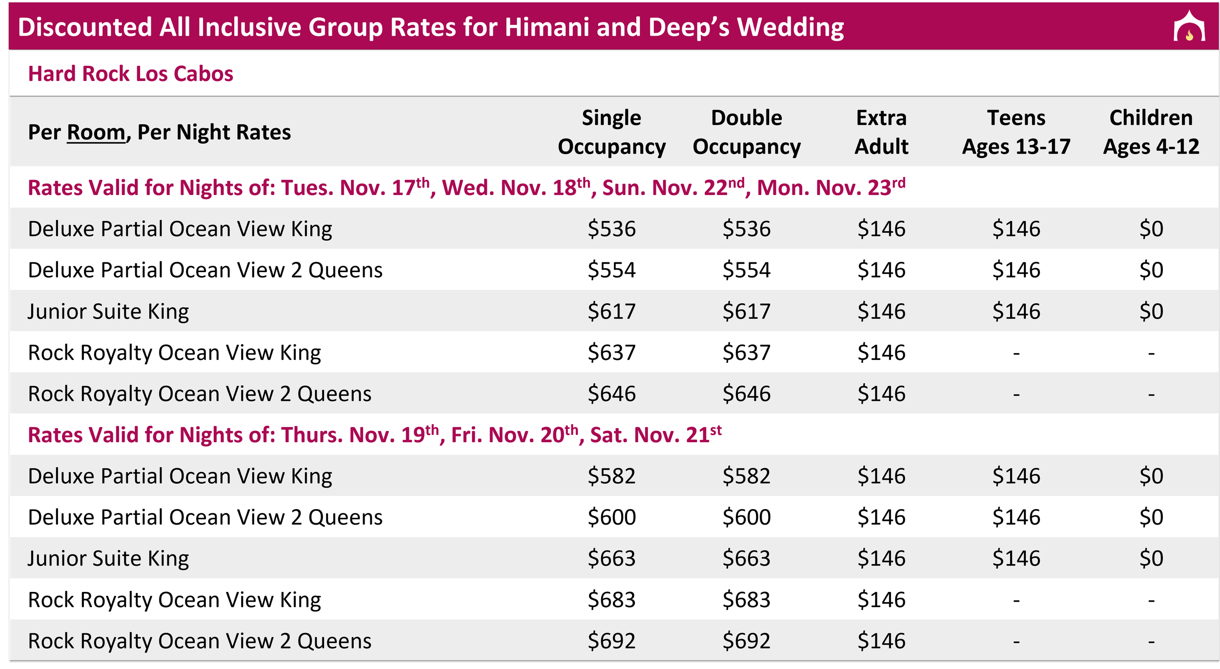 All rates are in USD and include hotel taxes and fees; The first two guests regardless of age are charged as adults; Children 0-3 are free but count towards max occupancy; Must book using discounted group rates to attend wedding events; 3 night minimum required