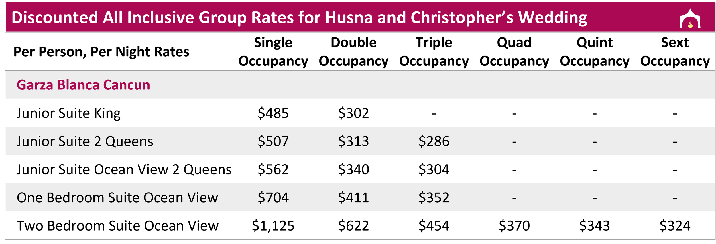 Husna and Christopher have secured discounted group rates for guests of their wedding! Rooms MUST be booked through their group block on this site by June 15, 2026 in order to attend wedding events, to be included in group promotions, to be protected by agency support in case of travel or other potential issues, to be given priority access to rooming requests and be placed in the group block located near the bride and groom's group. Guests booking on third party websites (like Expedia or Hotels.com) or on the hotel website directly will not be able to access wedding events.