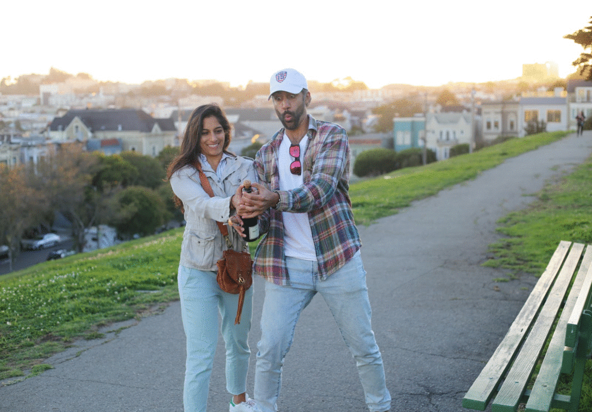 I had told Akansha that we were going to head up to Alta Plaza Park, a park right by our apartment in San Francisco, to help one of our good friends surprise his girlfriend and take some photos for their anniversary. Mini champagne bottle in hand, Akansha reluctantly scurried up the hill to join me in an impromptu self-photoshoot consisting of many unflattering jumping photos off park benches while we “waited” for our friends to arrive. As she got back up on the park bench, I tossed the camera over to our friend, got down on one knee and babbled a whole bunch of nonsense for why she should marry me. Somehow it was coherent enough for her to say yes and we have some killer sunset photos to remember the whole thing by.