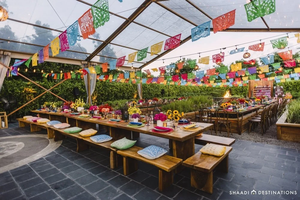 Our pool party was definitely the most hyped part of the wedding weekend. All of our guests were super excited about this. And it was special to us because it was post the Sikh wedding ceremony where we could all come together and just celebrate and have fun! Our thought around the pool party was to have something fun and chill after the ceremony instead of being rushed off to get ready for the reception. Breaking the days up really allowed our guests and us to have a relaxing evening and start to the reception day. We highly recommend breaking the ceremony and reception in two days for a destination wedding. I mean, people are already there, let them enjoy it!
