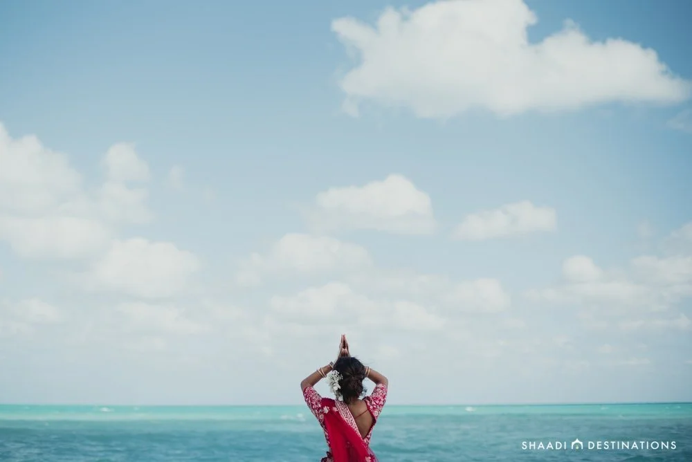 I have seen several bridal shoots that do capture the beautiful outfit displayed on a hanger, which I am not a fan of and didn’t think much of doing it myself. However, the morning of the wedding, I was having coffee on the balcony. The photographers and makeup artists arrived, and they loved my outfit so much that they couldn’t wait to start placing my outfit and jewelry pieces on me and started snapping a few pics to get an idea of angles etc. I quickly decided to do a casual shoot with my outfit and jewelry. I loved the fact that they captured the sunrise, the beach behind and some greenery at the same time the beautiful colors from the outfit, pretty much capturing the essence of the wedding day. Glad we did it.