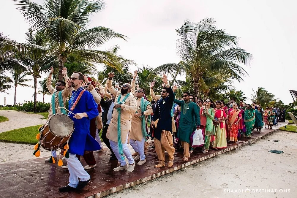 Loved this boardwalk baraat for Sonam and Hiren at Royalton Riviera Cancun! Courtesy of Jonathan Cossu Photography