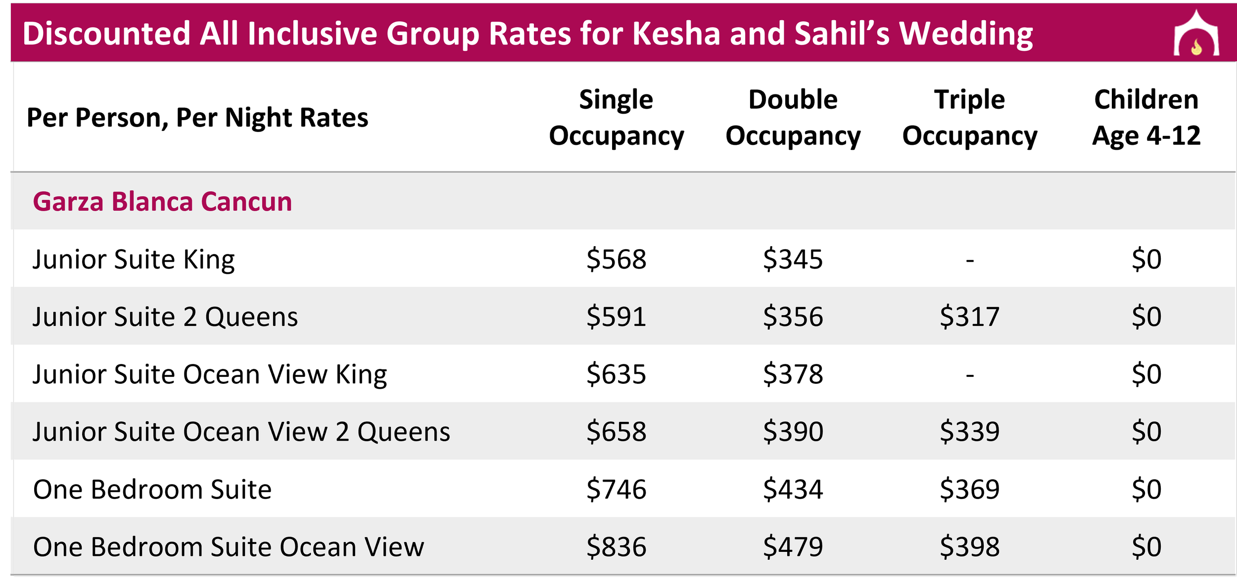 Kesha and Sahil have secured discounted group rates for guests of their wedding! Rooms MUST be booked through their group block on this site by September 1, 2026 in order to attend wedding events, to be included in group promotions, to be protected by agency support in case of travel or other potential issues, to be given priority access to rooming requests and be placed in the group block located near the bride and groom's group. Guests booking on third party websites (like Expedia or Hotels.com) or on the hotel website directly will not be able to access wedding events.