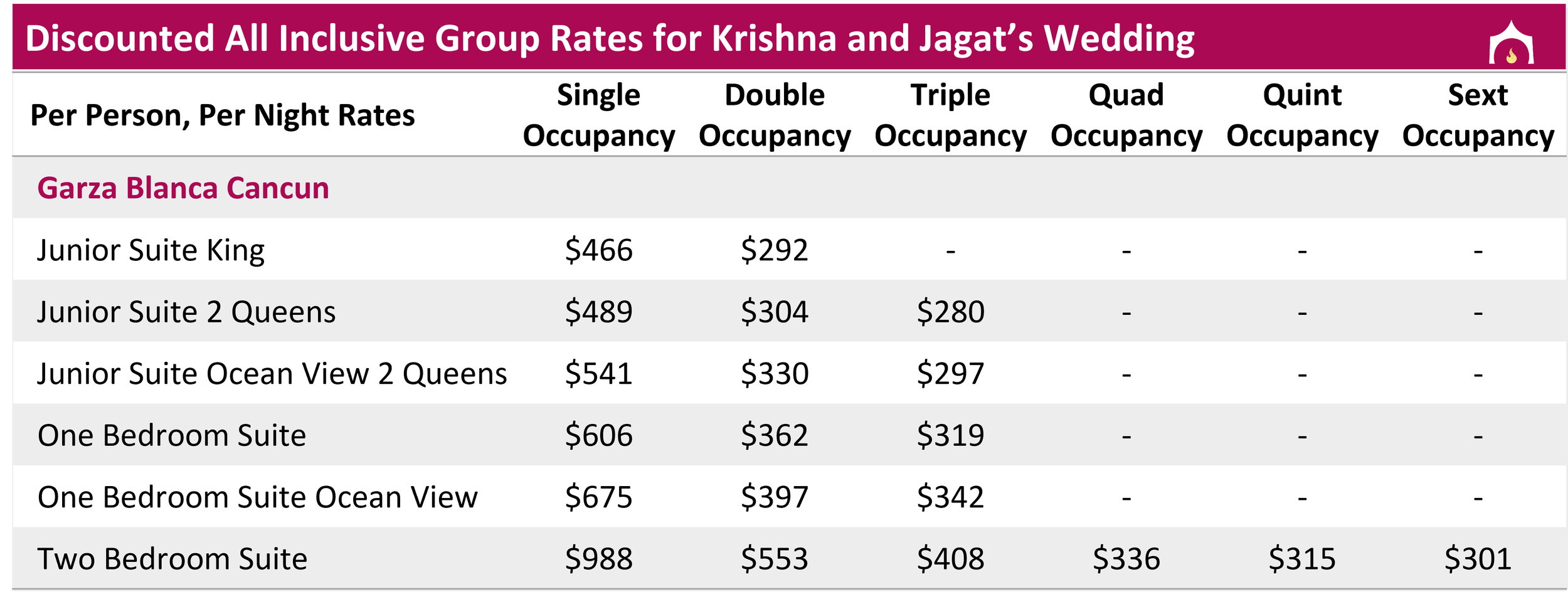 All rates above are in USD and include hotel taxes and fees; Must book using All Inclusive Group Rates to attend events; 3 night minimum required; A 33 MXN peso/night (~$2.00 USD) environmental tax is charged at check out, subject to change.