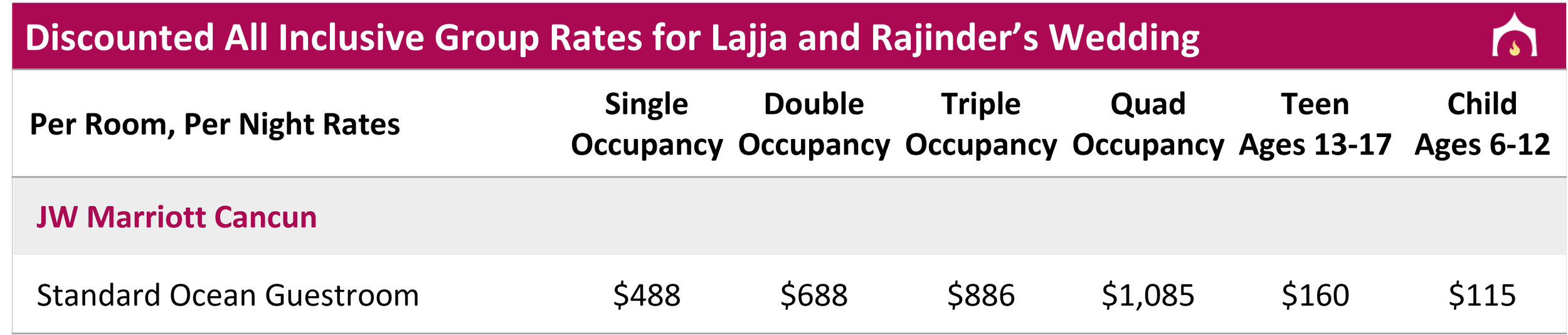 Lajja and Rajinder have secured discounted group rates for guests of their wedding! Rooms MUST be booked through their group block on this site by September 1, 2026 in order to attend wedding events, to be included in group promotions, to be protected by agency support in case of travel or other potential issues, to be given priority access to rooming requests and be placed in the group block located near the bride and groom's group. Guests booking on third party websites (like Expedia or Hotels.com) or on the hotel website directly will not be able to access wedding events.