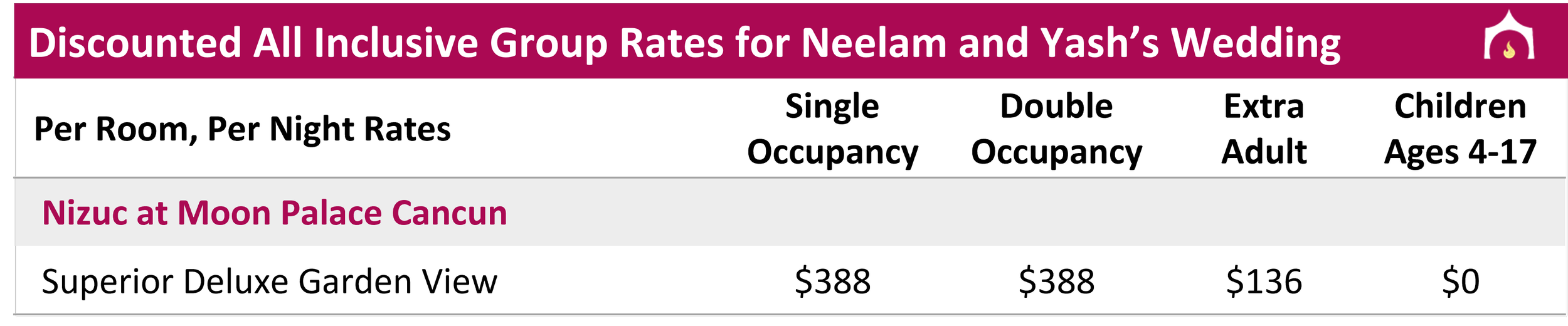 Neelam and Yash have secured discounted group rates for guests of their wedding! Reservations MUST be made through the couple’s contracted wedding block by March 1, 2026 to complete the RSVP process and attend wedding events. Reservations made directly with the resort, via online travel agencies such as Expedia or Hotels.com, or via a third party travel agency will not meet the venue’s requirements to complete the RSVP process. We appreciate your abidance and understanding of the destination wedding processes and procedures in place.