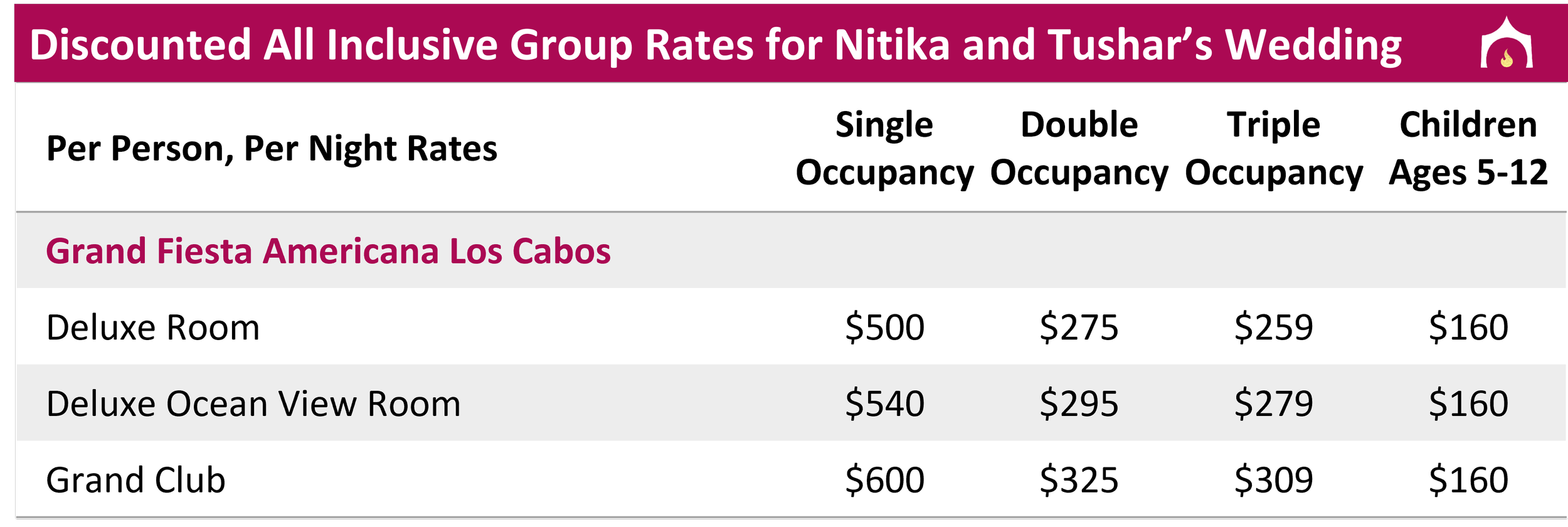 All rates are in USD and include hotel taxes and fees; The first two guests regardless of age are charged as adults; Children 0-4 are free but count towards max occupancy; Must book using discounted group rates to attend wedding events; 3 night minimum required; A 91 MXN peso/night (~$5.00 USD) environmental tax is charged at check out, subject to change.