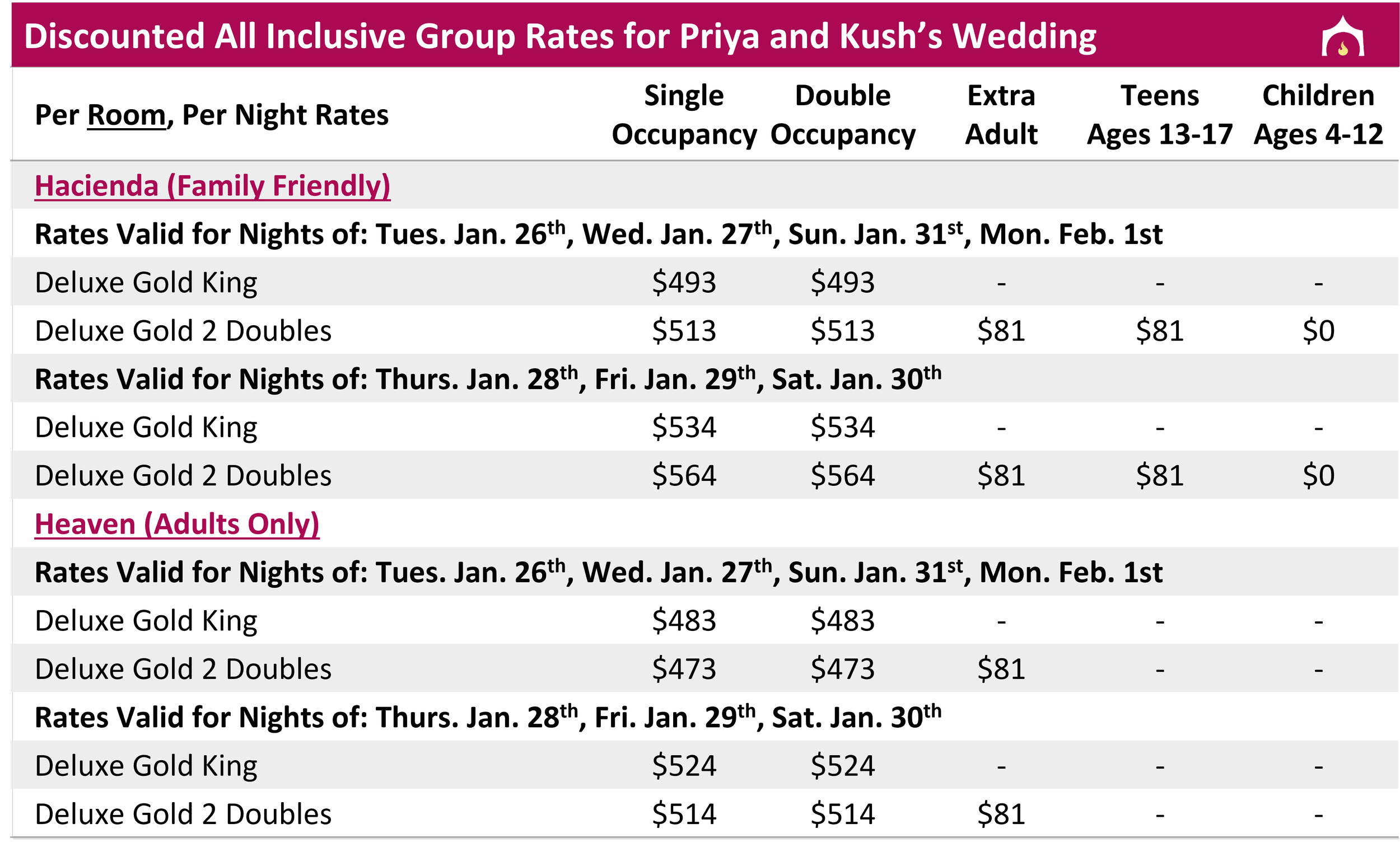 All rates above are in USD and include hotel taxes and fees; Infants 0-3 are free but count towards max occupancies; Must book through group to receive wedding wristbands required to attend wedding events; 3 night minimum stay required