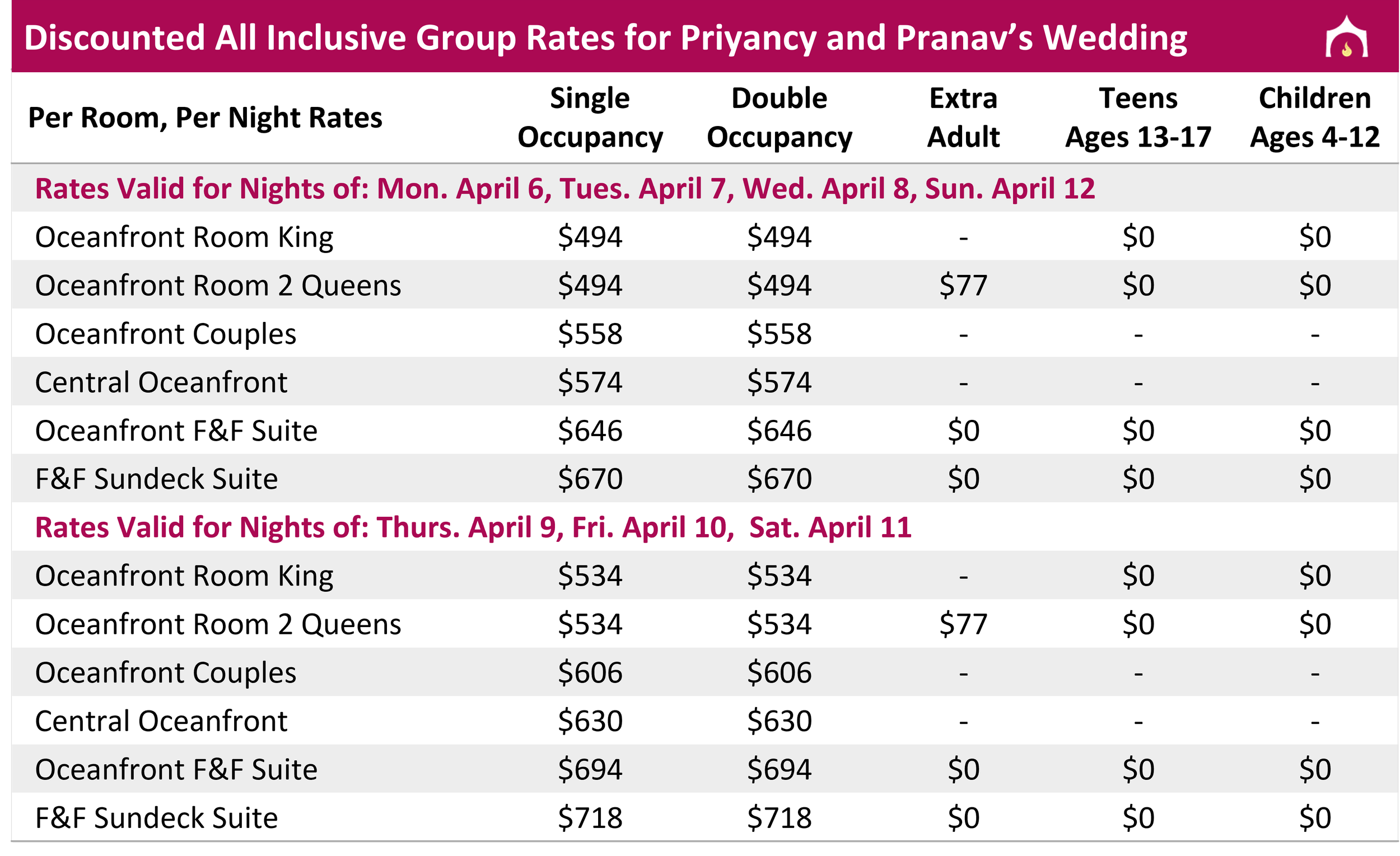 Priyancy and Pranav have secured discounted group rates for guests of their wedding! Reservations MUST be made through the couple’s contracted wedding block by January 1, 2026 to complete the RSVP process and attend wedding events. Reservations made directly with the resort, via online travel agencies such as Expedia or Hotels.com, or via a third party travel agency will not meet the venue’s requirements to complete the RSVP process. We appreciate your abidance and understanding of the destination wedding processes and procedures in place.