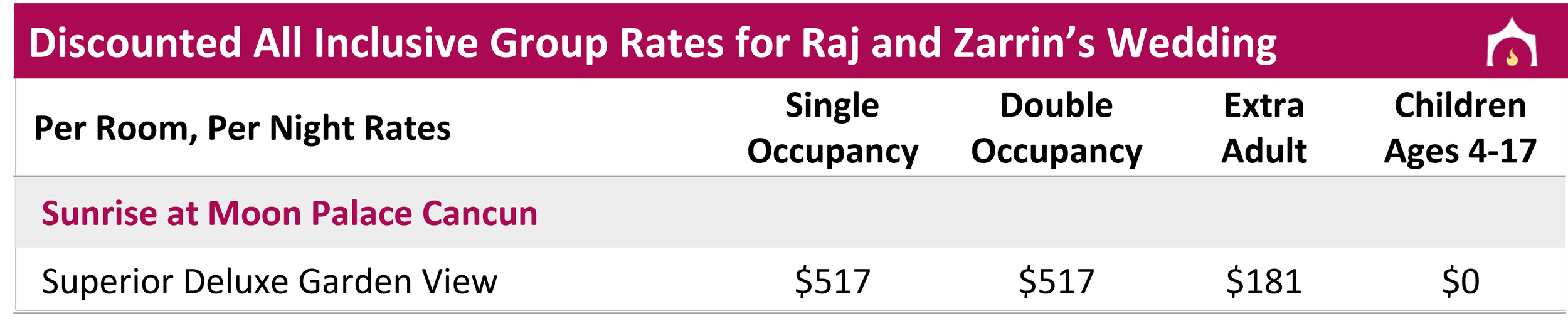 Rates are in USD and include hotel taxes and fees; The first two guests regardless of age are charged as adults; Must book using discounted group rates to attend wedding events; 3 night minimum required; A 33 MXN peso/night (~$2.00 USD) environmental tax is charged at check out, subject to change.