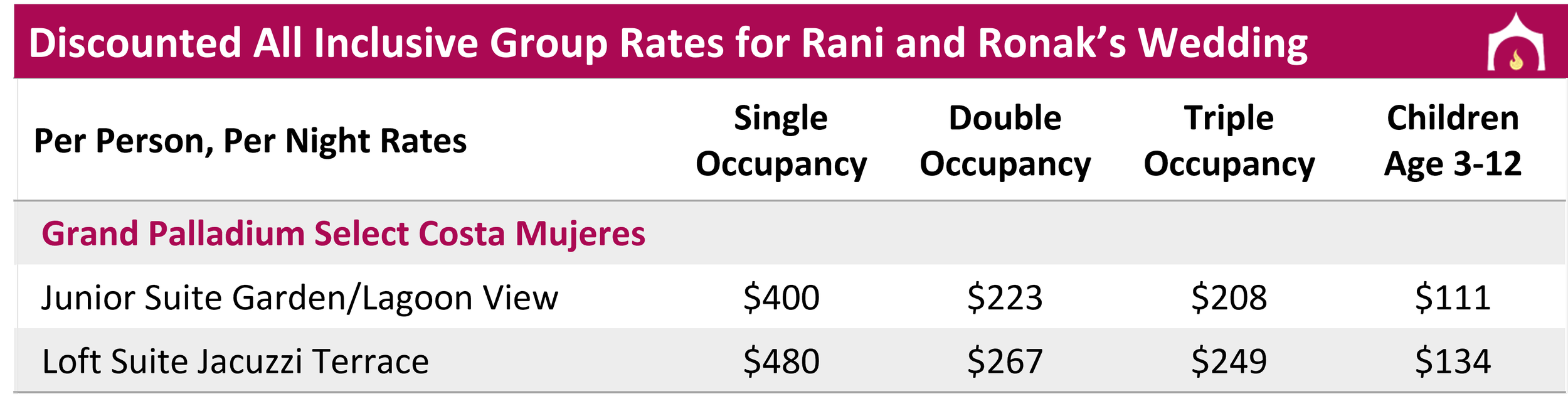 Rani and Ronak have secured discounted group rates for guests of their wedding! Reservations MUST be made through the couple’s contracted wedding block by December 1, 2026 to complete the RSVP process and attend wedding events. Reservations made directly with the resort, via online travel agencies such as Expedia or Hotels.com, or via a third party travel agency will not meet the venue’s requirements to complete the RSVP process. We appreciate your abidance and understanding of the destination wedding processes and procedures in place.