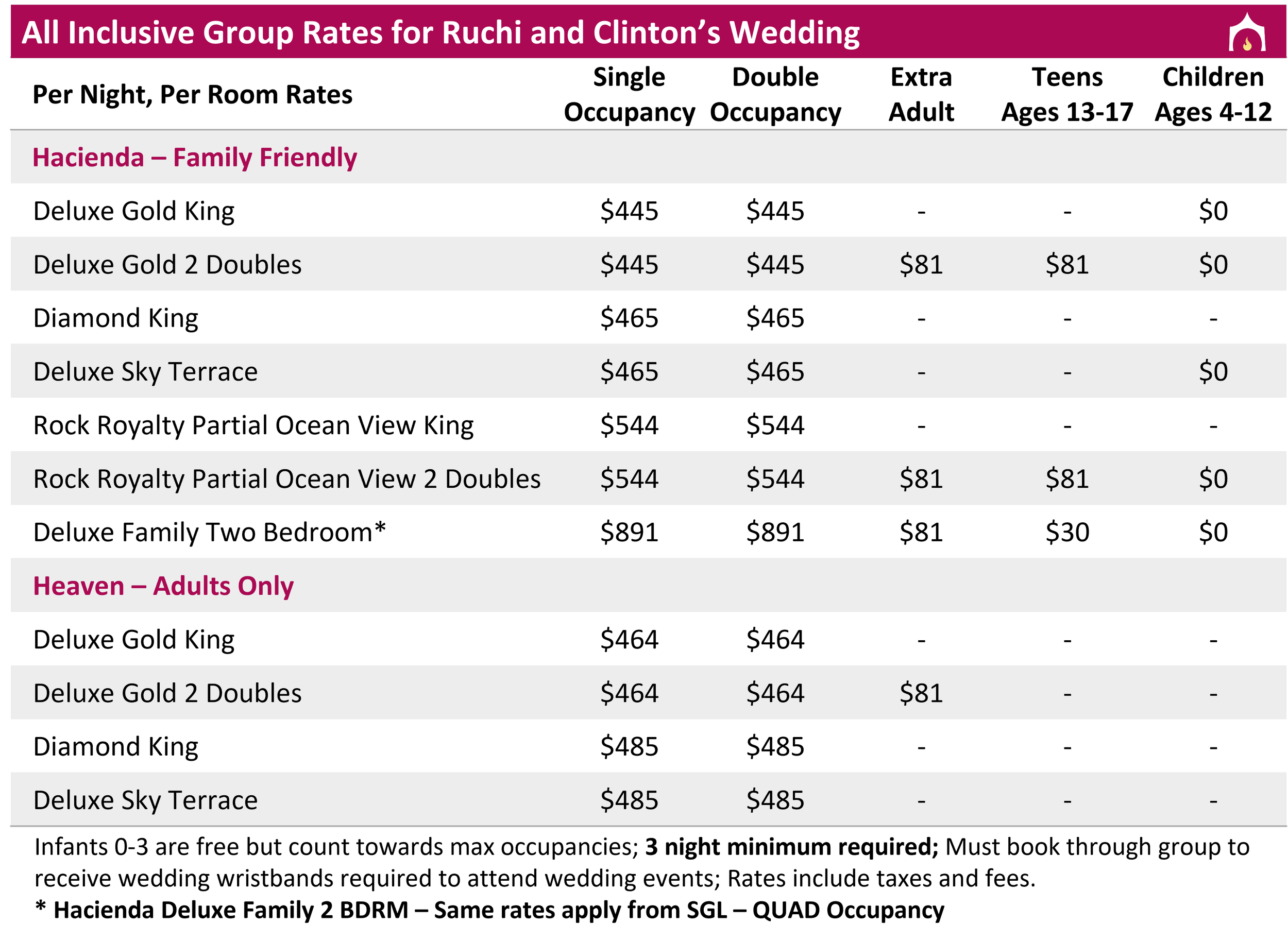 While there is a 3 night minimum, most guests choose to add nights before and after the wedding in order to enjoy the incredible resort with friends and family. Please feel free to take advantage of this rate from Tuesday, December 2, 2025-Tuesday, December 9, 2025.