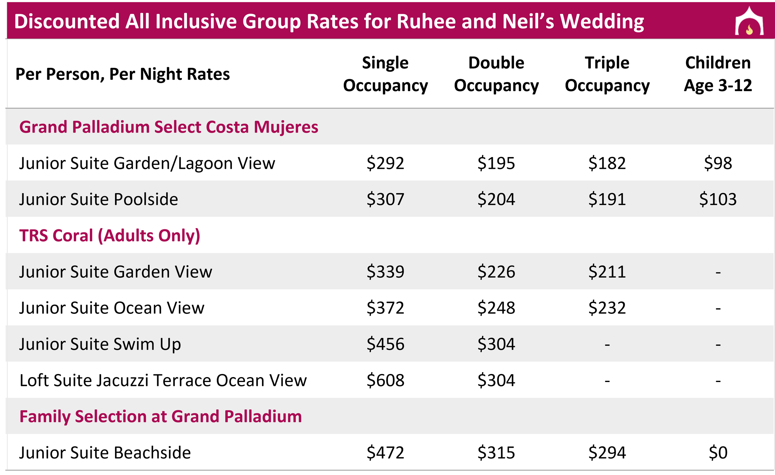 Rates are in USD and include hotel taxes and fees; The first two guests regardless of age are charged as adults; Infants 0-2 are free but count towards max occupancies; Must book using discounted group to attend events; 3 night minimum required; A 37 MXN peso (~$2 USD) / night environmental tax is charged at check-out