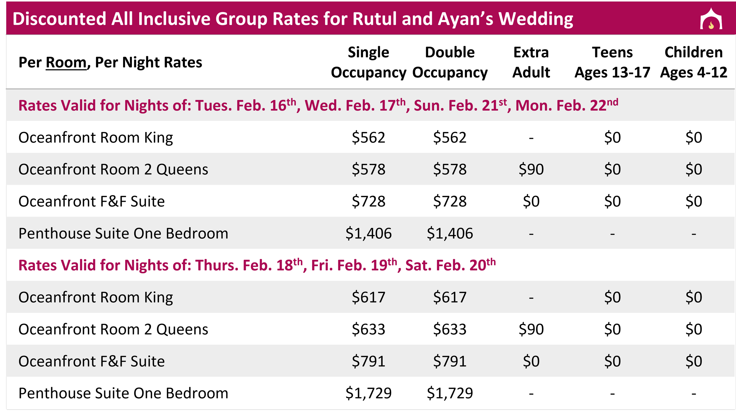 All rates above are in USD and include hotel taxes and fees; Infants 0-3 are free but count towards max occupancies; Must book through group to receive wedding wristbands required to attend wedding events; A 37 MXN peso/night (~$2 USD) environmental tax is charged at check out, subject to change; 3 night minimum stay required
