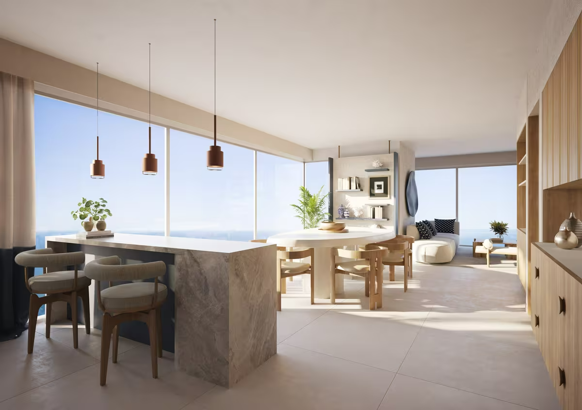 At the height of AVA with sweeping oceanfront views, our one-bedroom Penthouse Suite features a master bedroom with walk-in closet and private terrace, two spa-inspired baths, spacious living room with L-sofa lounge and TV, indoor dining for eight, as well as an expansive private terrace with daybed, al fresco dining for eight, and a 6-person spa tub for soaking it all in.