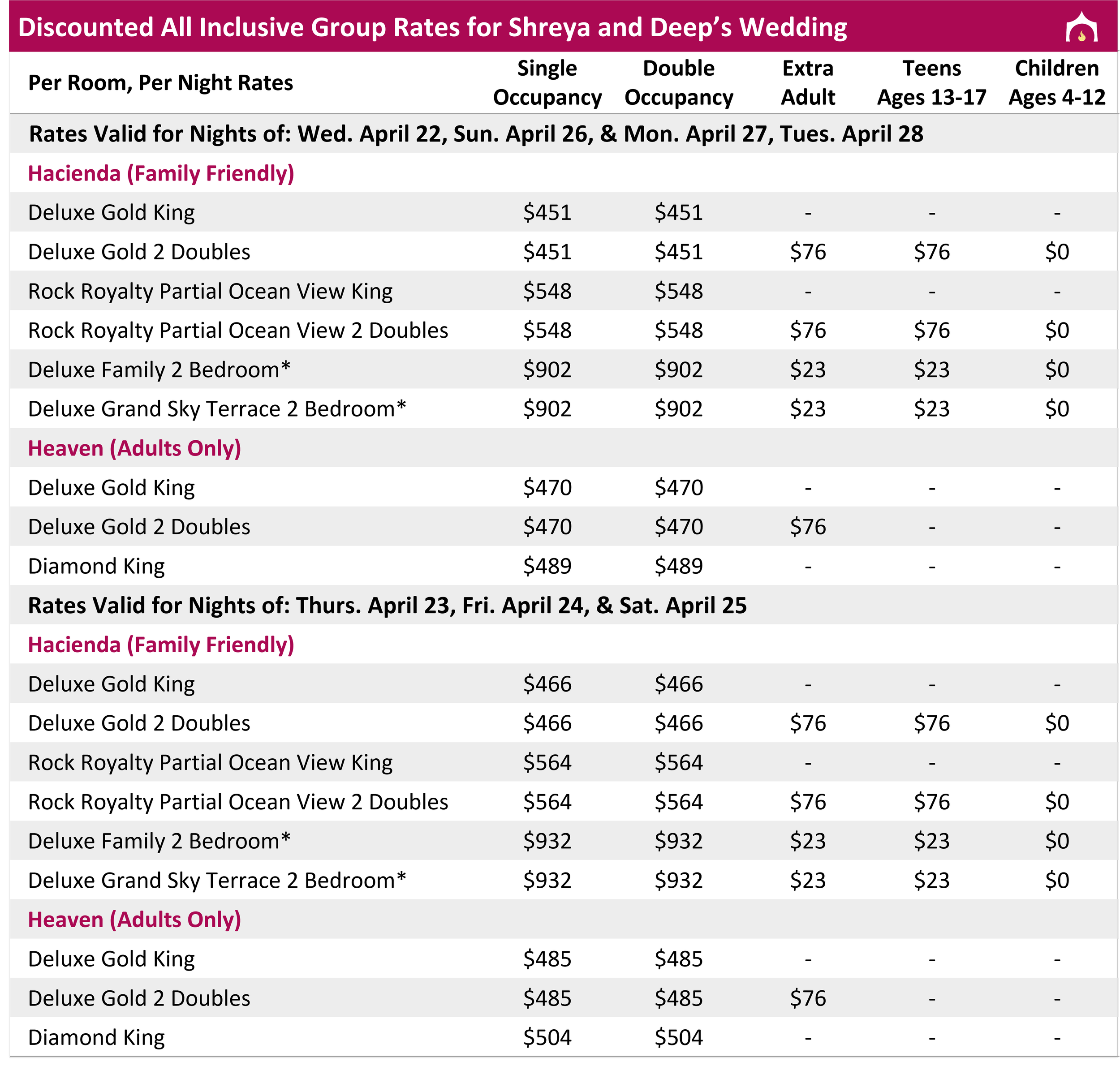 All rates are in USD and include hotel taxes and fees; Infants 0-3 are free but count towards max occupancies; 3 night minimum required; Must book through group to receive wedding wristbands required to attend wedding events