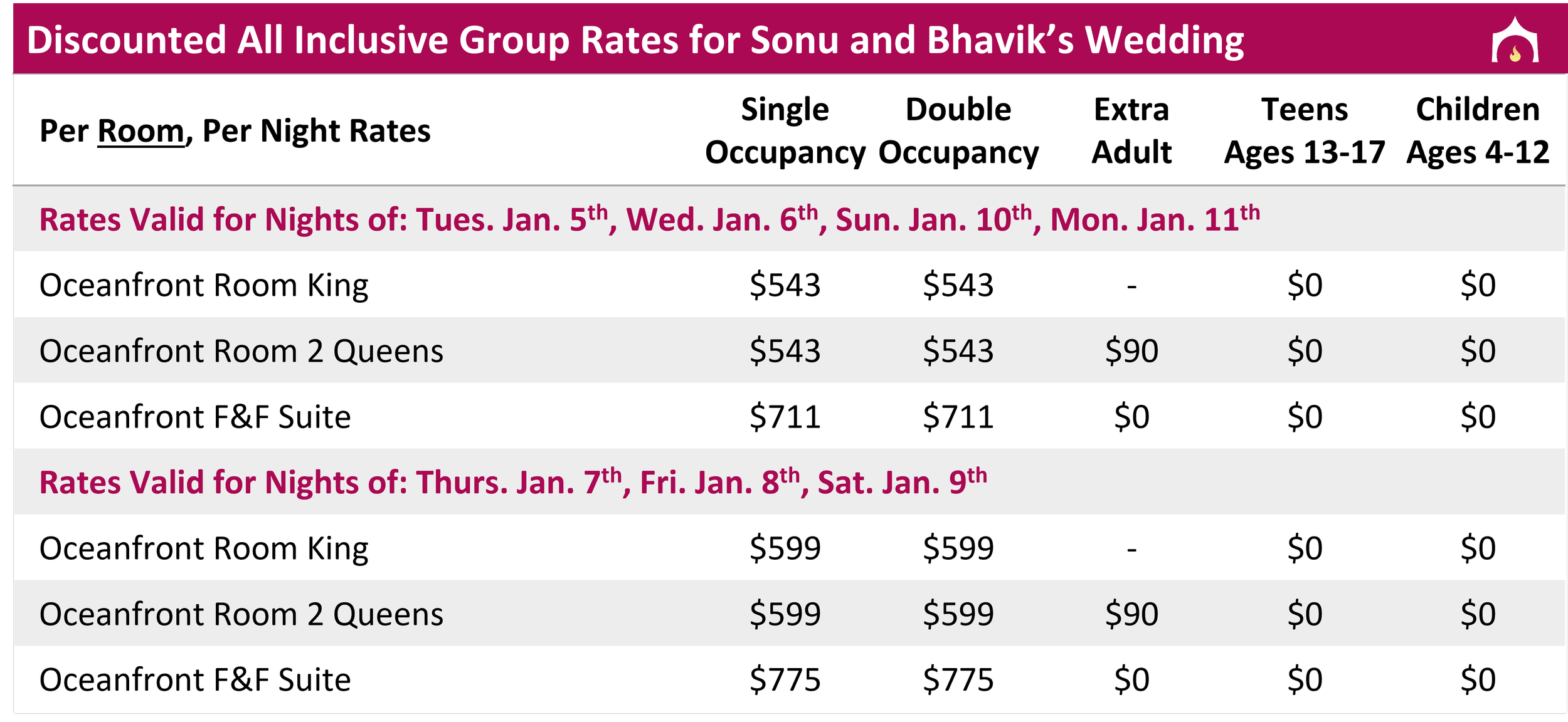 All rates above are in USD and include hotel taxes and fees; Infants 0-3 are free but count towards max occupancies; Must book through group to receive wedding wristbands required to attend wedding events; A 37 MXN peso/night (~$2 USD) environmental tax is charged at check out, subject to change; 3 night minimum stay required