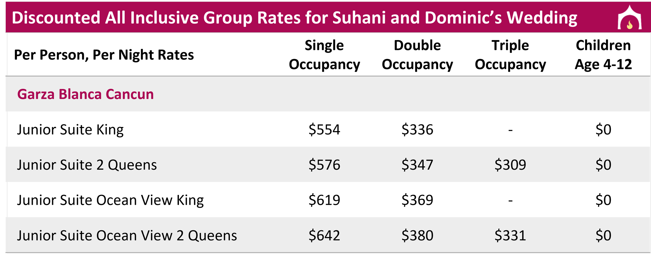 Suhani and Dominic have secured discounted group rates for guests of their wedding! Rooms MUST be booked through their group block on this site by September 1, 2026 in order to attend wedding events, to be included in group promotions, to be protected by agency support in case of travel or other potential issues, to be given priority access to rooming requests and be placed in the group block located near the bride and groom's group. Guests booking on third party websites (like Expedia or Hotels.com) or on the hotel website directly will not be able to access wedding events.